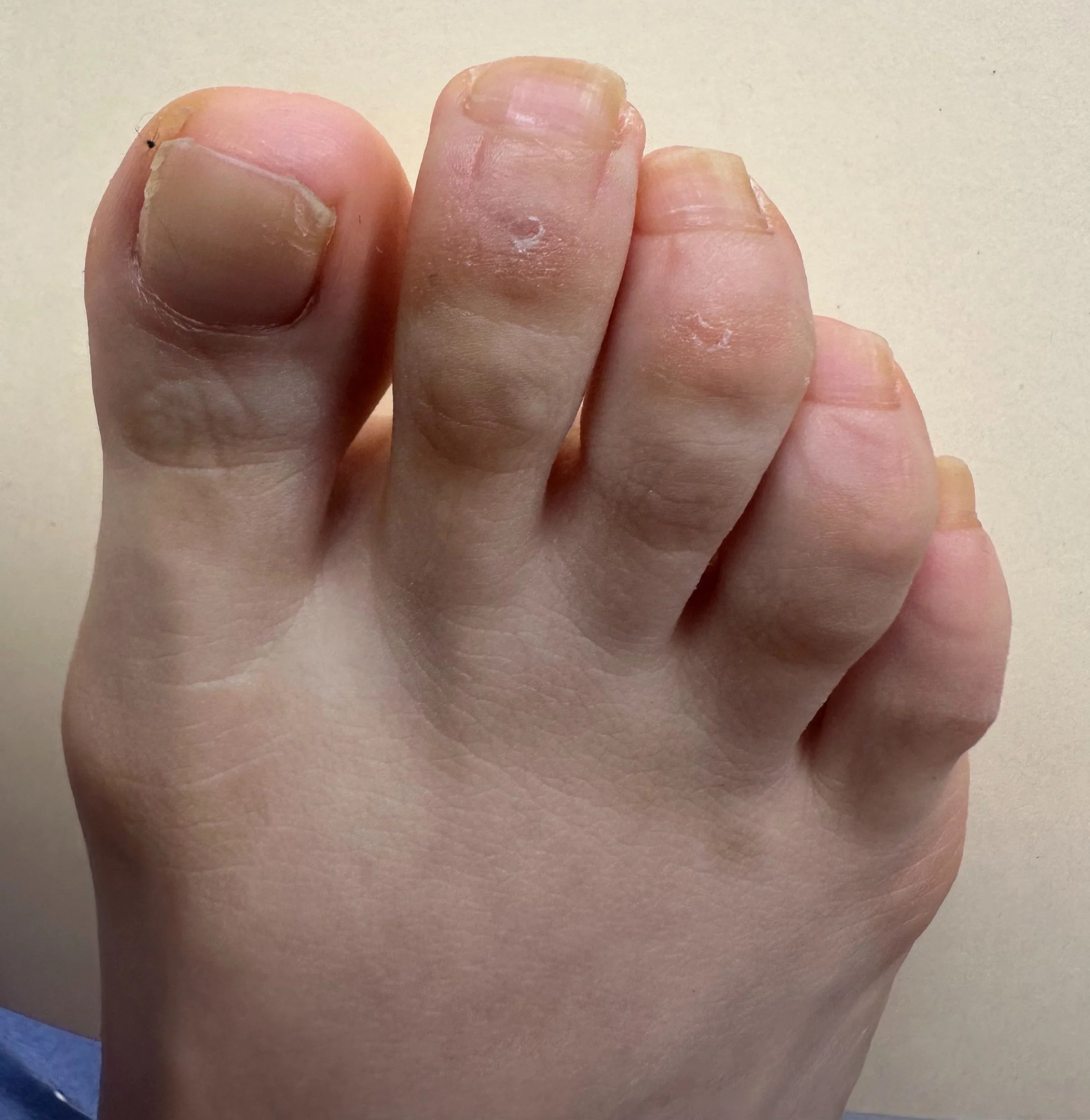The skin infects the nails and the nails infect the skin. Notice the patients left foot is reddish and then look at the nails of the left foot.